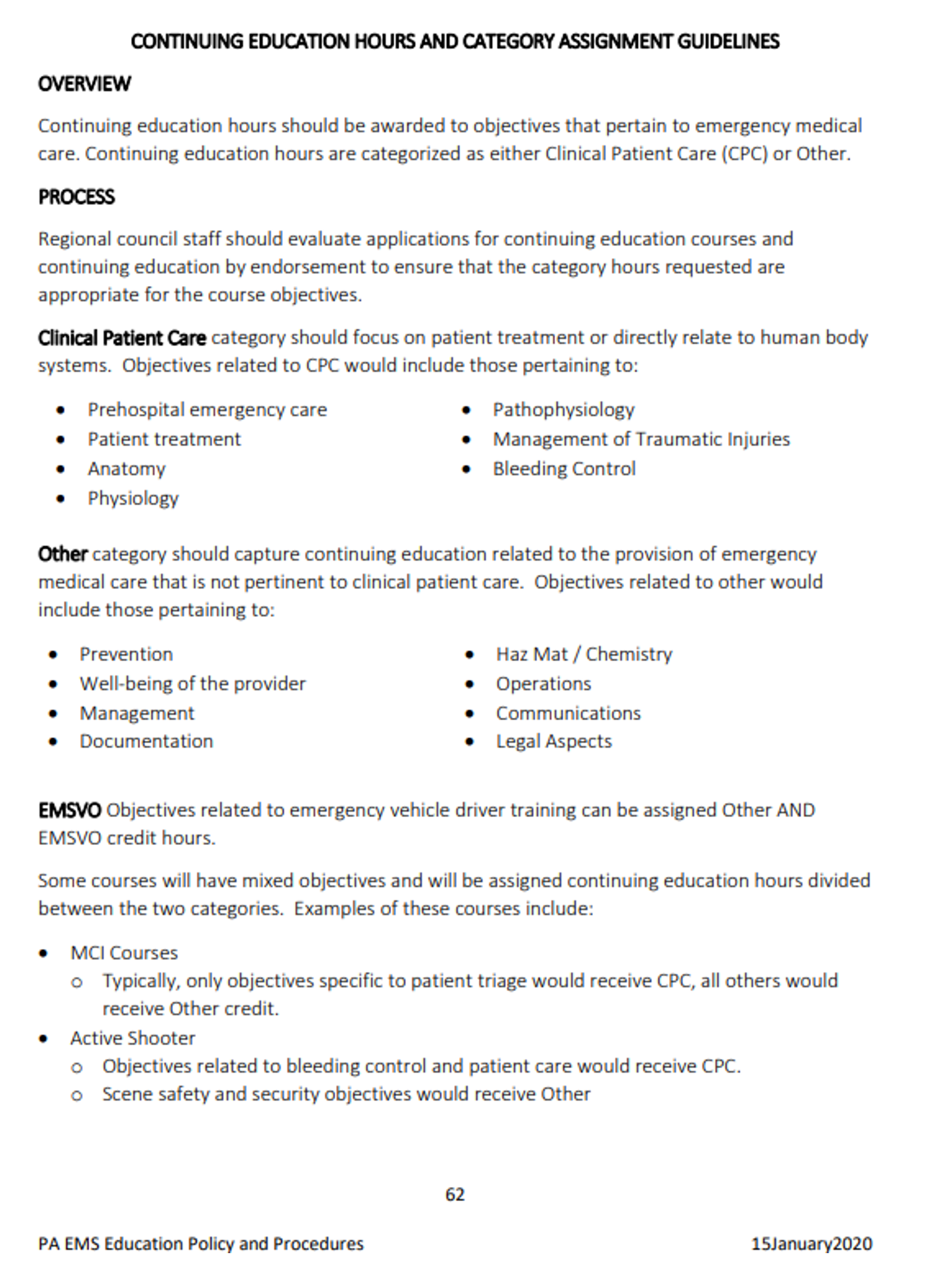 For Pennsylvania the below talks about the different types of credit. You must complete at least 16 hours of Continuing Education within your 3 year certification period. 12 of those Con-Ed credits must in the CPC (Critical Patient Contact) category. The rest can be in the Other Category. If you are EMSVO certified, then you need at least 3 EMSVO Con-Ed credits.
